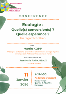 • Une conférence avec Martin Kopp le dimanche 11 janvier à 14h30 au temple de Manosque avec la participation Jean Marie Patoureau de CCFD-Terre solidaire sur le thème : “Ecologie : quelle(s) conversion(s)?, quelle espérance ? “- un regard chrétien